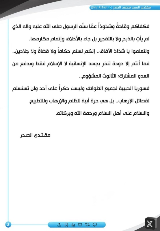 نعى زعيم التيار الوطني الشيعي مقتدى الصدر، اليوم الجمعة ( 26 كانون الأول 2025 )، شهداء التفجير الذي استهدف مسجد الإمام علي في مدينة حمص السورية، محذراً من تداعيات خطيرة قد تقود إلى حرب طائفية جديدة.