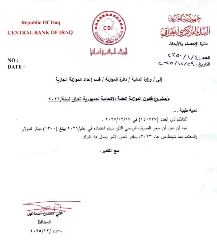 البنك المركزي يخاطب المالية بشأن سعر صرف الدولار الرسمي في موازنة 2026