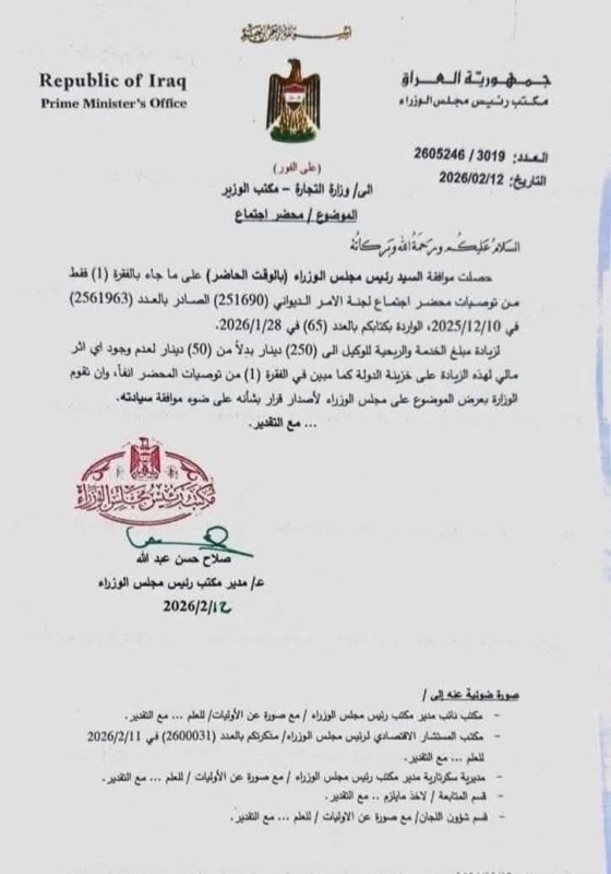 السوداني يوافق على زيادة مبلغ الخدمة الربحية لوكيل التموين خمسة أضعاف (وثيقة)
